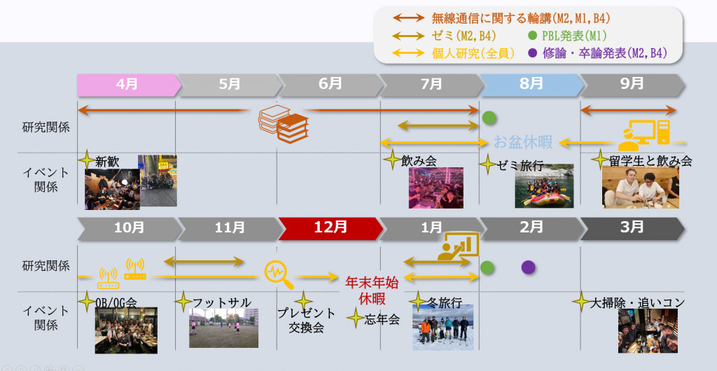 4月の新歓から始まり、研究活動やゼミは年間を通して行われます。4月から9月には無線通信に関する輪講を行い、基礎知識を蓄えます。学部4年生 (B4)や修士2年生 (M2)は定期的にゼミを行い、個人研究に関する発表を行います。修士1年生 (M1)はPBL形式の授業を通してチームで研究を進め、定期的に進捗や成果を発表します。